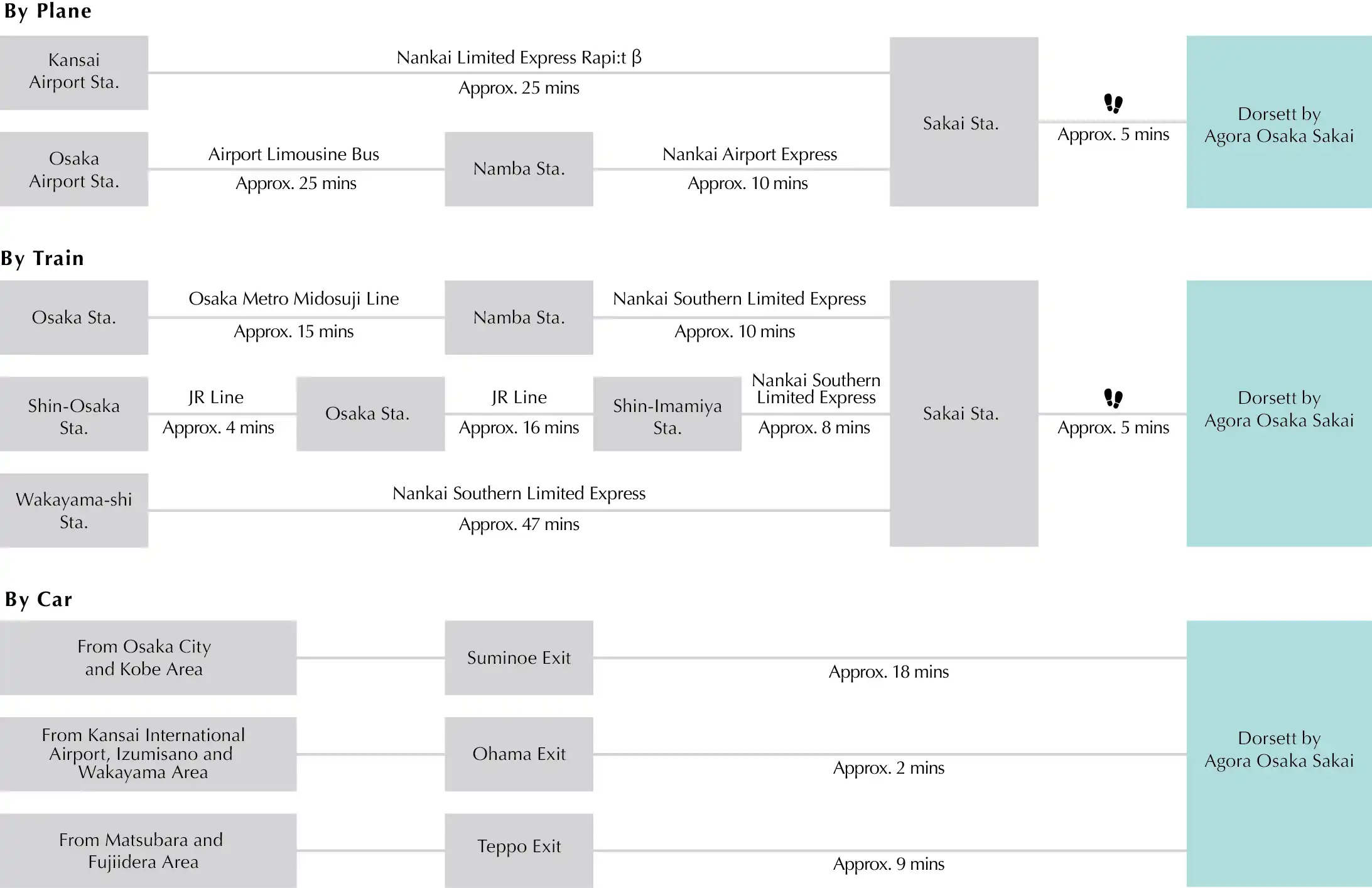 Conveniently located just a 5-minute walk from Sakai Station on the Nankai Main Line, Dorsett by Agora Osaka Sakai offers seamless access to Kansai International Airport and Wakayama via the "Rapi β" and "Southern" rapid express trains. Only three stops away from Namba, Osaka's vibrant hub for shopping, dining, and entertainment, our hotel ensures exceptional convenience.