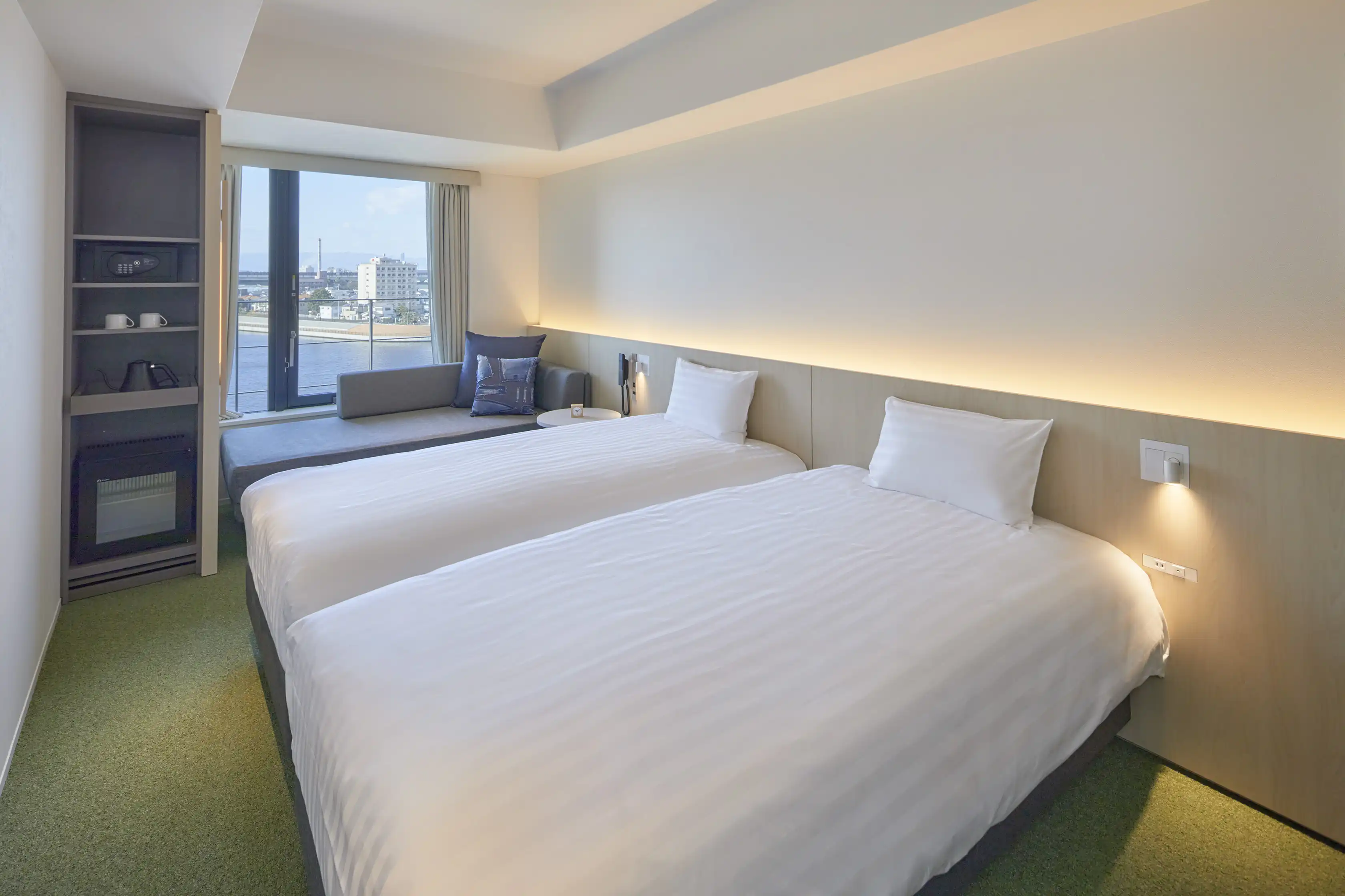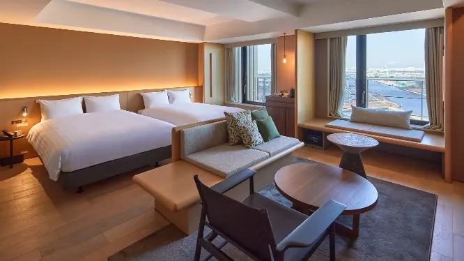 Indulge in luxury with our Superior Twin Harbour View Room, offering breathtaking views of the historic Sakai Old Port and waterfront promenade. Expansive windows flood the room with natural light, creating an open and airy ambiance for you to relax during your stay.