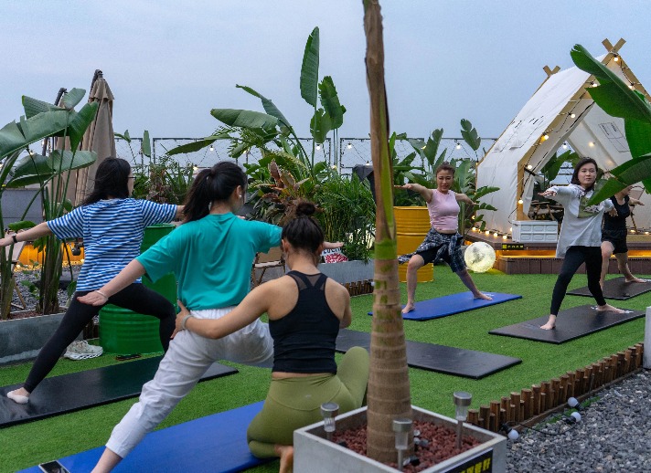 Inviting guests in the store to participate in yoga classes. In the sunset of the city, guests flock to feel their own tranquility with relaxed postures and calm breathing - outdoor yoga, a dialogue with the soul of nature!