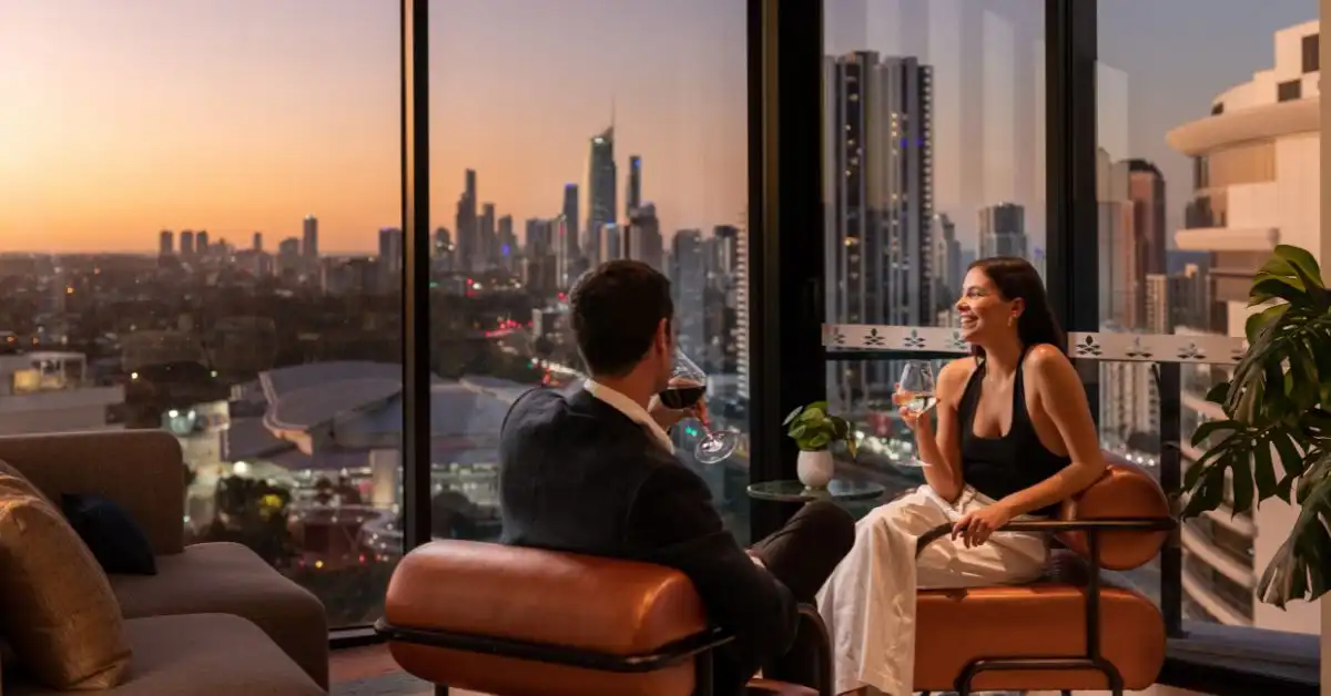 Offering expertly crafted cocktails and an indulgent selection of canapés. Imagine sipping your drink as the sun dips below the horizon, painting the Gold Coast skyline in hues of pink and gold – pure perfection.