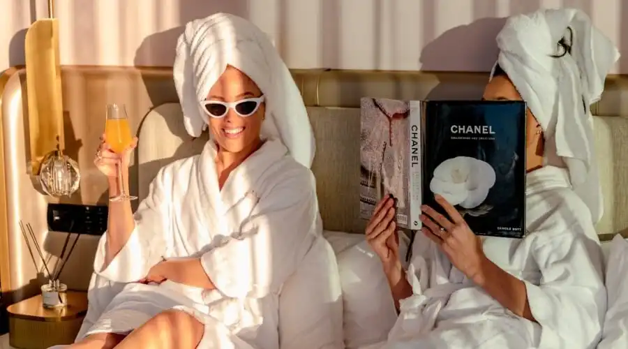 Two women in white robes in a Dorsett Gold Coast hotel room