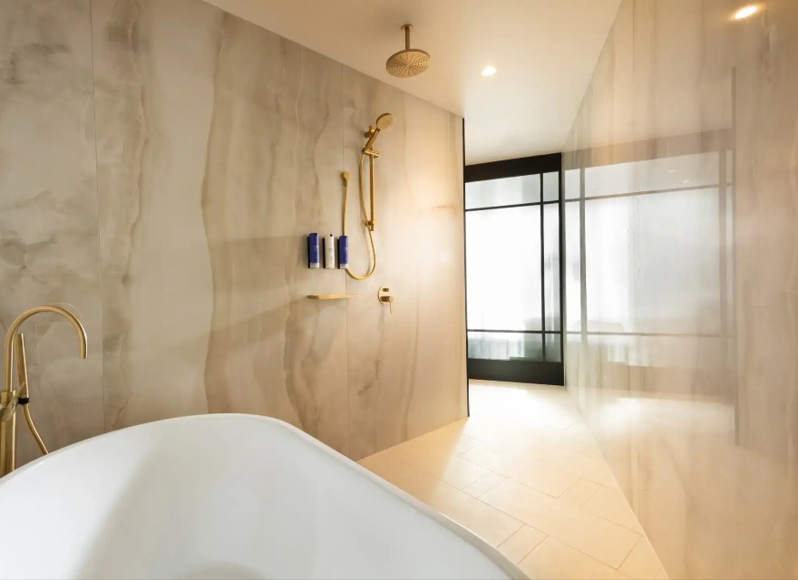 The suite features a separate living and dining area and a bedroom with a king bed. Guests can relax and rejuvenate in the stand-alone bathtub, walk-in rain shower, or Netflix and chill with the large flat-screen smart TVs with complimentary Wi-Fi.