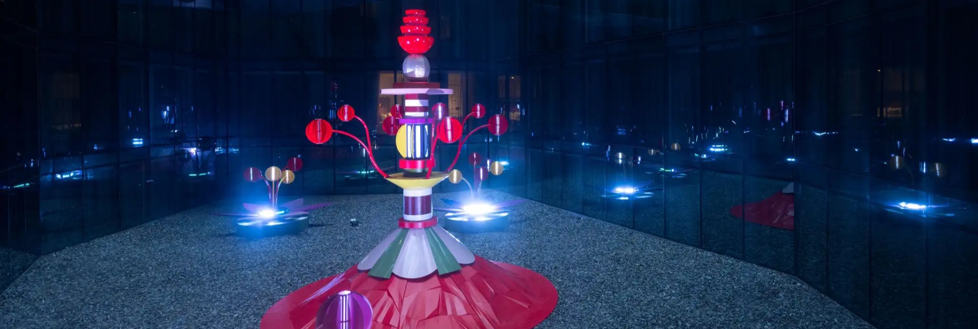 The Diva sculpture has delicate long arms with lanterns at the tips that appear to wave in the air providing softness while being attractively reflected in the black mirrored surface of the surrounding fa9ades. The three flower pods gravitate towards the Diva, representing the seeds of creativity that are sprouting from her. Each flower stamen has a lantern in the tip that lights the petals as the sun goes down. With this setting, the atrium will be converted into a delightful flora-based fairytale land. A garden of sculptures that will inspire a smile day and night!
