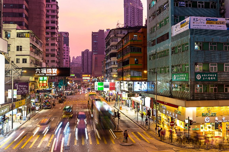 • City market in Mongkok with neon lights and busy streets at night