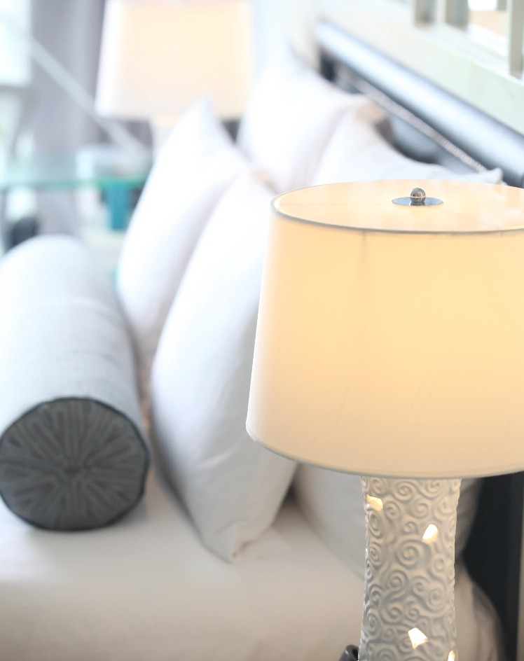 • Lamp beside the bed in a Dorsett Shanghai Hotel bedroom.