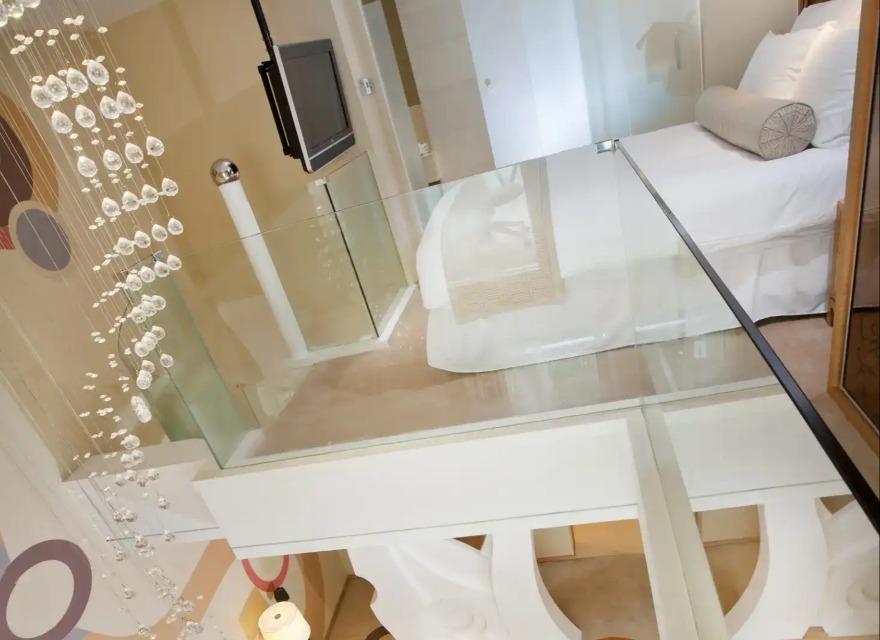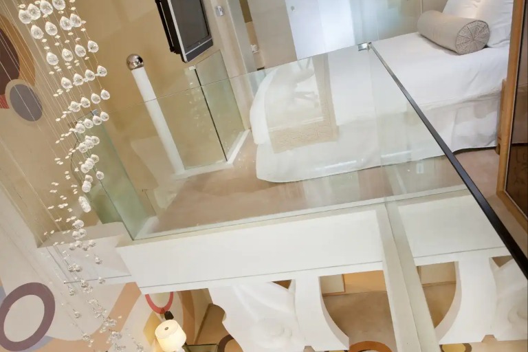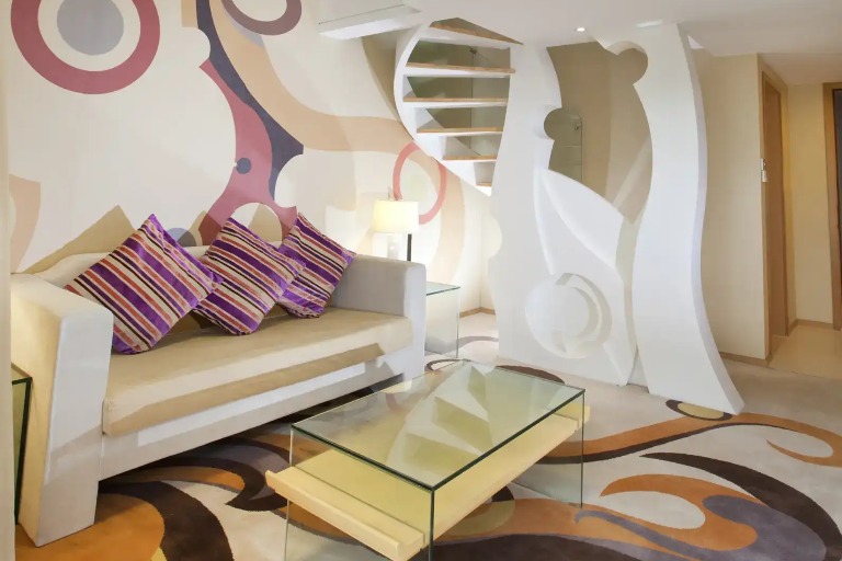 复式套房共两层,夹层设有一间舒适的卧室,为客人提供充足的空间和私密性。下层是舒适的座椅和用餐区,是放松和娱乐的理想场所,还有一个迷你储藏室,备有各种必需的生活用品。