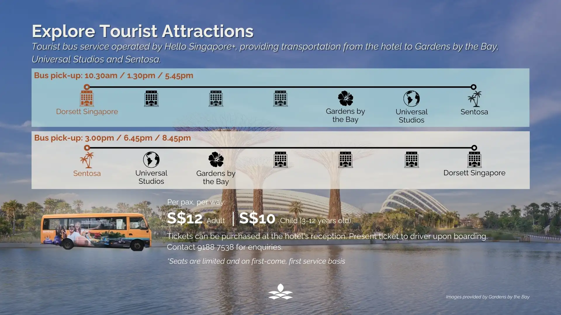 巴士票价:成人每人每程 S$12 / 儿童每人每程 S$10。