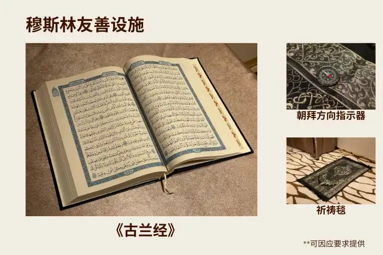 546间客房和套房均设有朝拜方向指示,确保客人可以轻松找到祈祷的方向,而部分客房更配有智慧马桶坐浴盆,为旅客带来便利。酒店还可因应要求提供《古兰经》和祈祷毯,让客人在整个住宿期间都能保持精神修练。