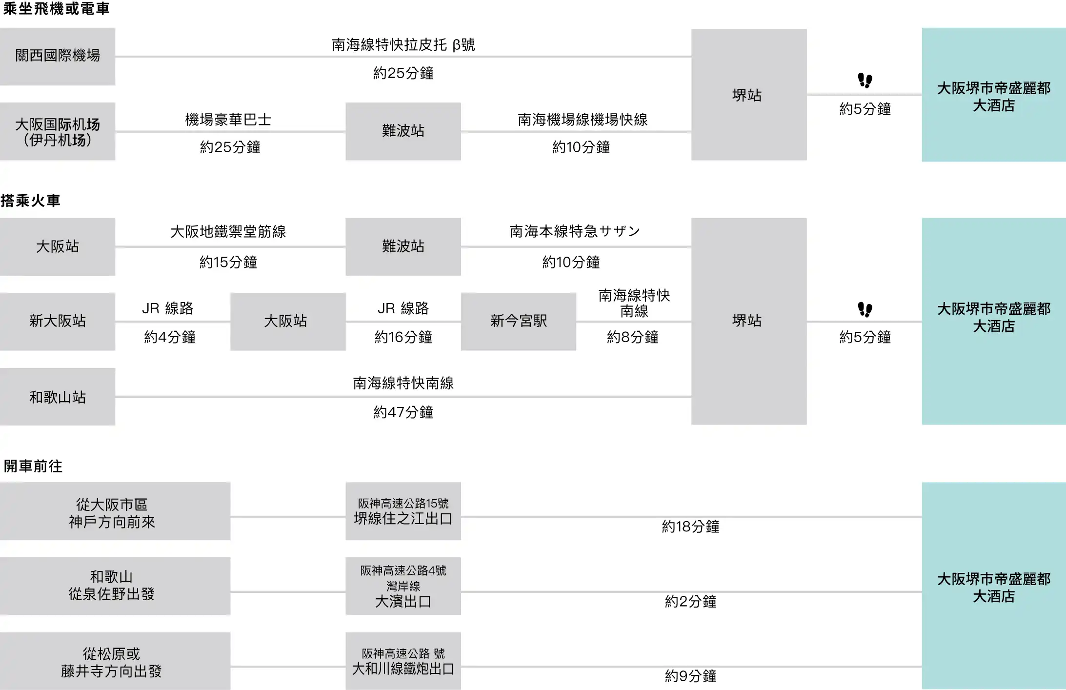 可搭乘付費巴士從南海高野線「堺東站」到南海本線「堺站(與酒店相連)」
