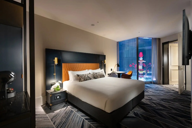 每個房間都配有一台大屏智能電視、一張舒適的特大床、帶步入式雨淋浴的套間浴室、豪華的ELEMIS SmartCare洗浴用品、茶咖設施、工作桌和免費的高速WiFi。