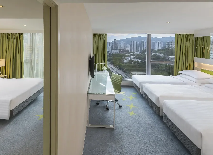 相連客房內中間帶有房中門,提供一張雙人大床及三張單人床。每間客房均可遠眺部分山景翠綠景緻,房內提供衣櫃及完善配套設施包括空氣淨化機,配有雅潔清新的綠色家具及落地玻璃窗,是4至5人家庭的理想選擇。