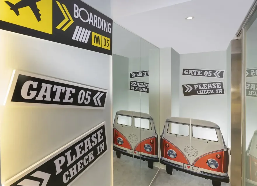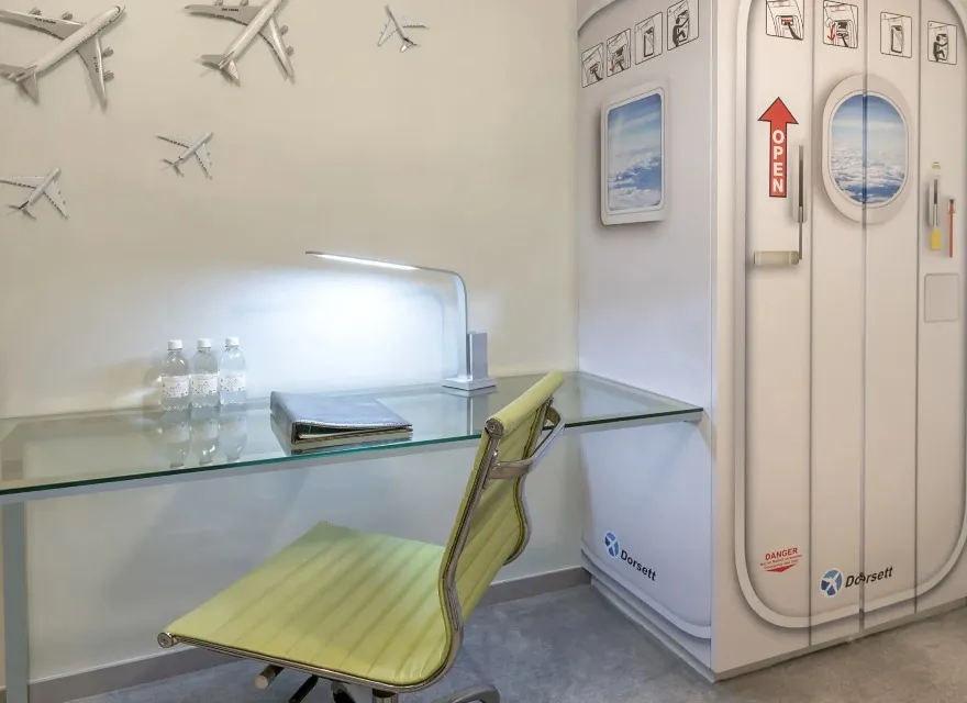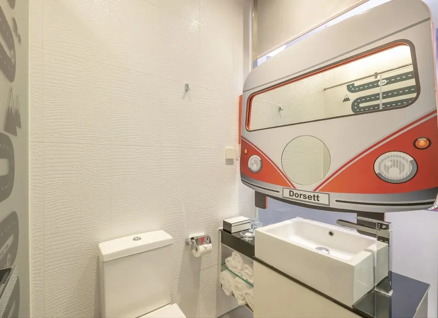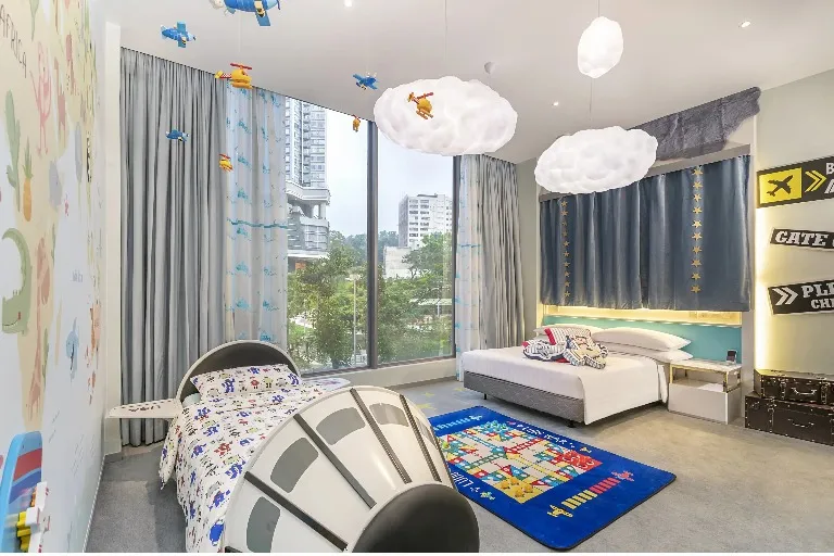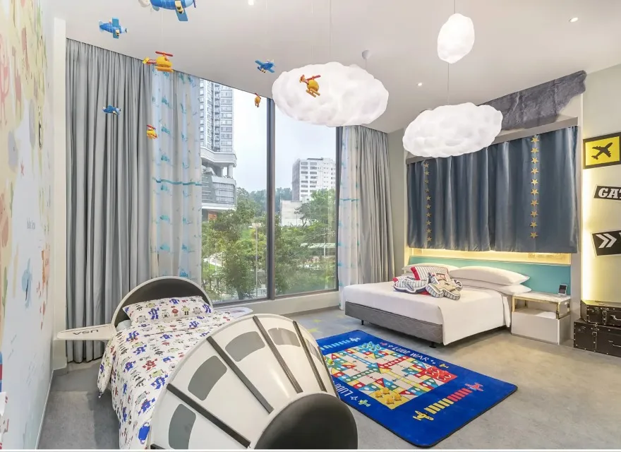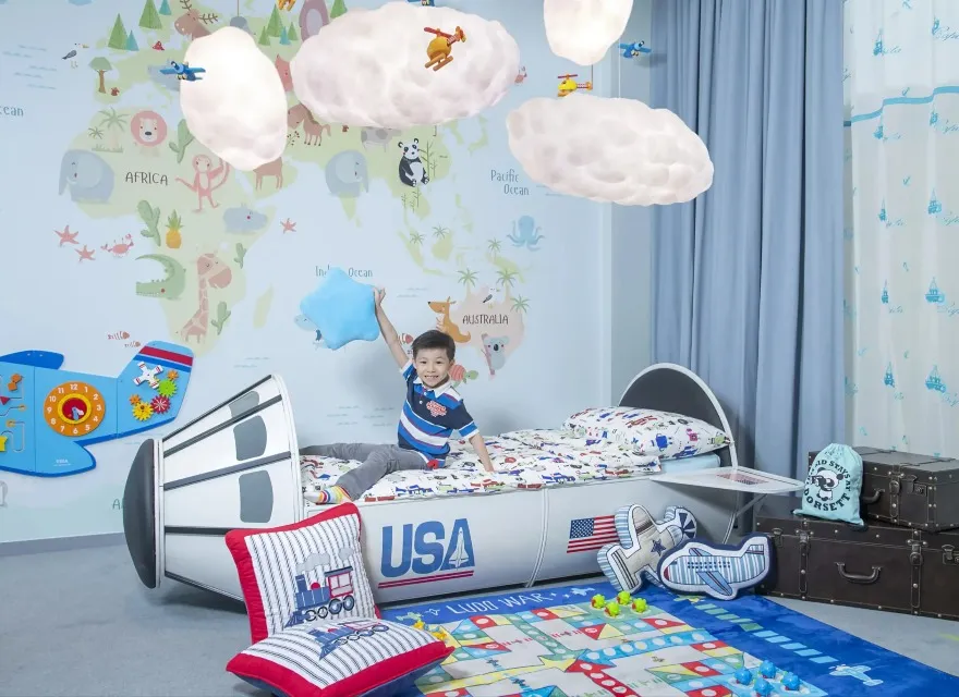 在旅遊探索家主題客房,孩子們可乘坐獨特的太空船兒童床進入太空。天藍色的牆紙,加上各種飛機裝飾及雲形吊燈,令您感受到飛行的無拘無束!伴隨著太空艙設計的衣櫃,小孩子可換上衣服,在柔軟的飛行地毯上與父母一起參與悠閒好玩的飛行棋遊戲,與您所愛的孩子們一起度過美好時光。