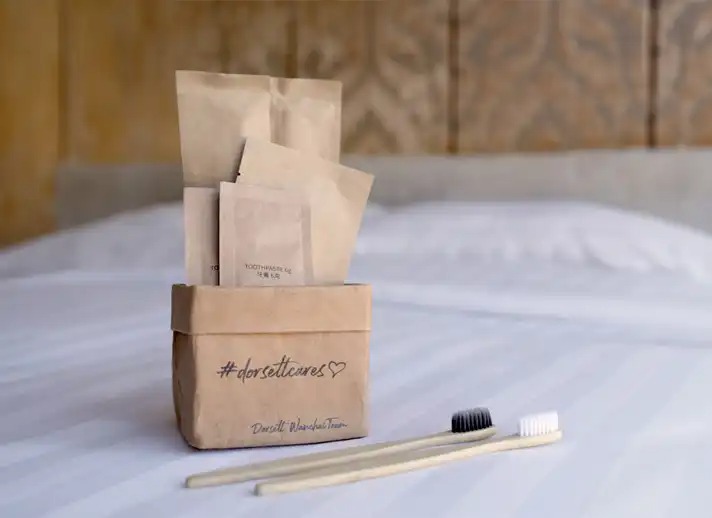 秉承對可持續發展的承諾,酒店全新推出綠色低碳浴室用品系列,竹制牙刷、牙膏等用品均採用低二氧化碳消耗的FSC認證牛皮紙包裝。