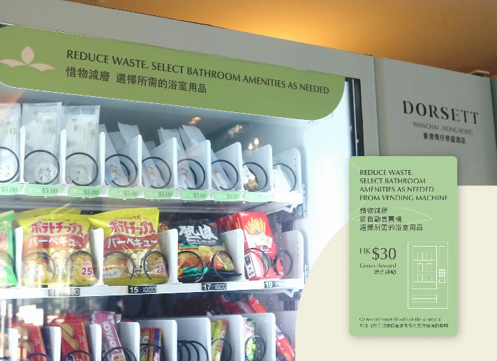如客人在入住期間不需要客房服務,我們將以HK$20自動販賣機現金消費額作為綠色獎勵回饋給客人,感謝客人支持酒店節約資源、減少碳足跡。